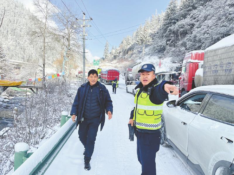 临近春节,前往阿坝州赏玩冰雪的游客持续增多。为保障道路畅行和游客安全,阿坝州派人前往主要道路和旅游景区巡护。图为理县公安在国道317线尽头寨路段为前往鹧鸪山滑雪场的游客提供帮助。 阿坝州公安局供图