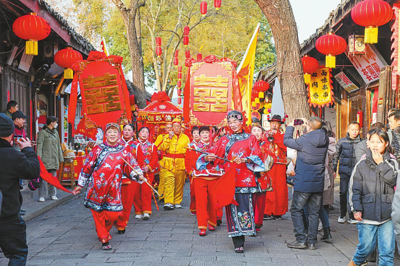 2月3日,南充市阆中古城街道上热闹非凡,民间艺人正在进行婚嫁民俗表演。 王玉贵 摄(C视觉)