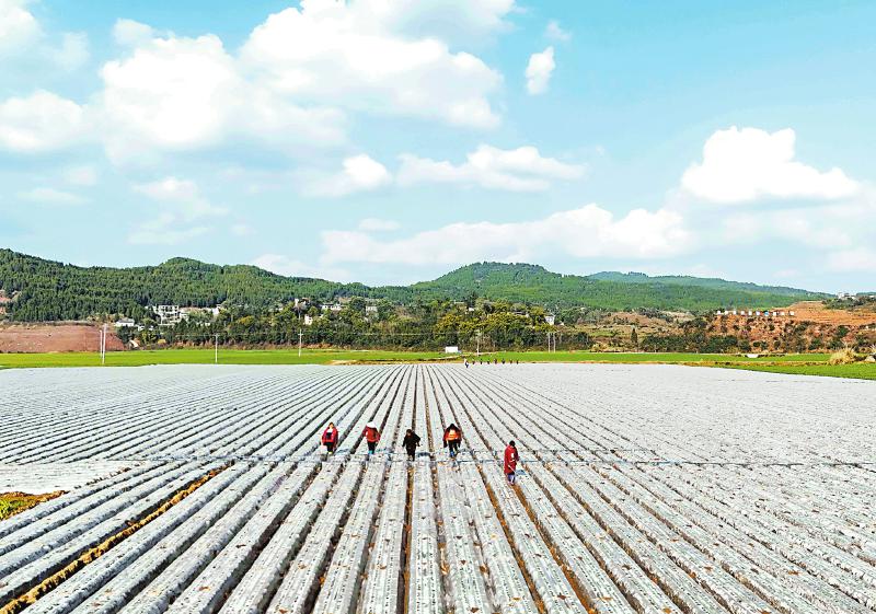 2月3日,正值立春节气,南充市蓬安县锦屏镇中坝社区蔬菜种植基地,村民在萝卜地进行破膜露苗作业。周亮 摄(C视觉)