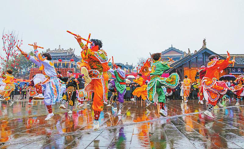 2月1日,遂宁市船山区龙凤古镇,一场精彩的非遗英歌舞巡游在此上演。 张晓 摄(C视觉)