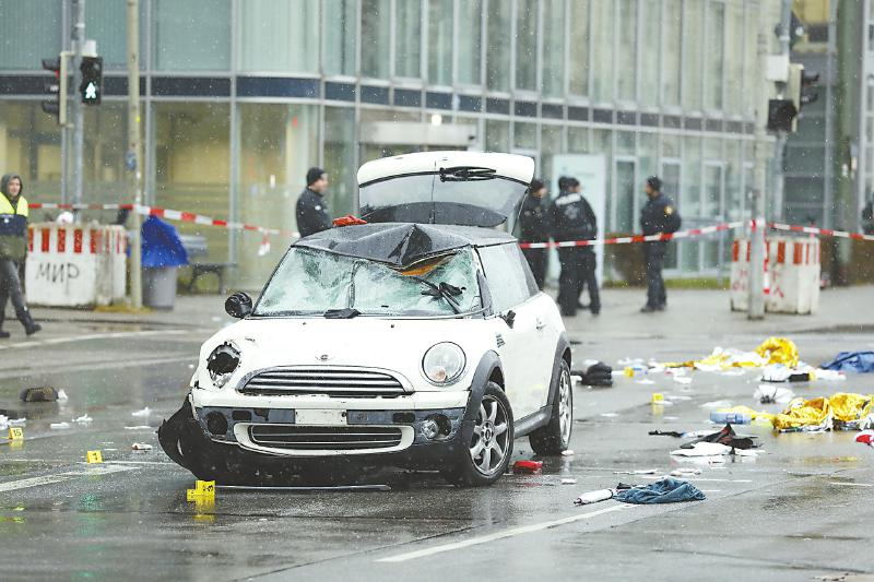 这是2月13日在德国慕尼黑的车辆冲撞人群事件现场拍摄的受损车辆。 新华社记者 张帆 摄