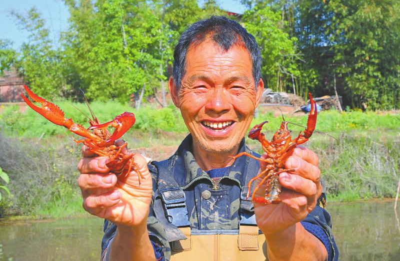 4月18日,在眉山市仁寿县曹家镇清泉村的稻虾共养基地,村民正在展示收获的小龙虾。 潘帅 摄(C视觉)