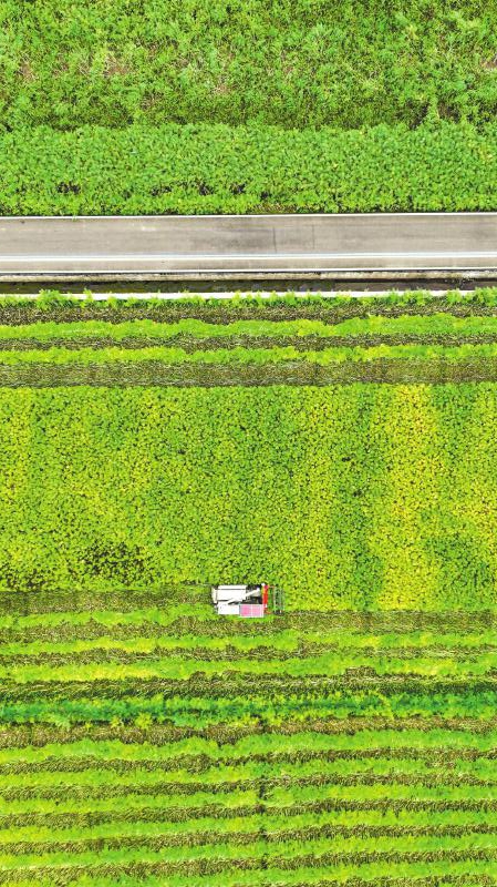 4月24日,高县粮油现代农业园区的5000亩油菜开镰收割。园区采取两段式机械化作业,加快抢收油菜,为接下来的水稻移栽打好时间提前量。 陶坤 摄(C视觉)