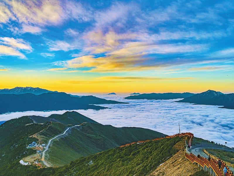宝兴县达瓦更扎景区于去年9月20日正式对外开放,仅2个月游客便接近3万人次,实现旅游收入110余万元。今年清明小长假期间,该景区一度因游客爆满而临时关停。达瓦更扎在藏语中意为“美丽的神山”。 图为4月12日,在宝兴达瓦更扎观景平台,游客既能欣赏浩瀚的云海,又能远眺云端之上的贡嘎群峰、四姑娘山美景。 黄刚 摄