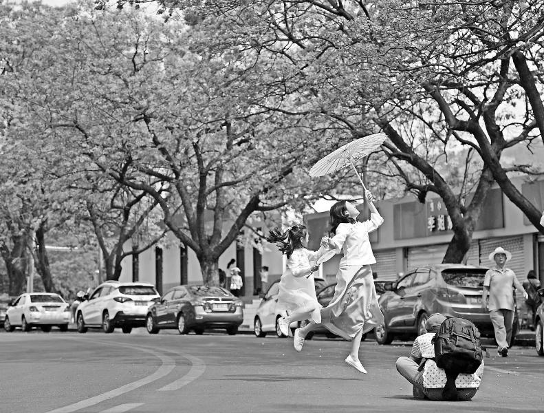 4月,西昌市大批蓝花楹怒放,吸引众多市民观赏留影,成为名副其实的“网红打卡地”。西昌市蓝花楹于上世纪80年代从福建引种,每到4月中下旬盛开,将航天北路、文汇路等街道染成紫色,美不胜收。本报记者 肖雨杨 摄