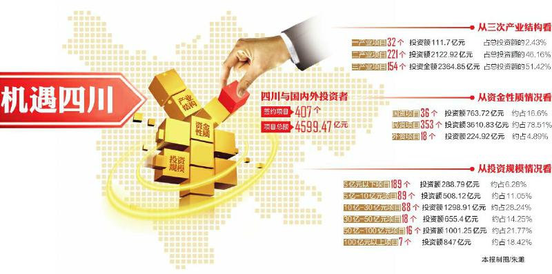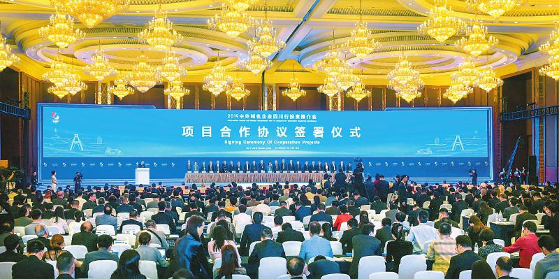 4月17日举行的2019中外知名企业四川行投资推介会暨项目合作协议签署仪式上,58个项目现场集中签约。 本报记者 郝飞 摄