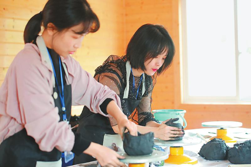 荥经黑砂古法烧制技艺于2017年被列入国家级非物质文化遗产名录。图为4月13日,来自省内外多个艺术院校的师生和砂器制作爱好者,在第三届荥经黑典黑砂设计大赛现场,创作黑砂艺术品。 黄刚 摄