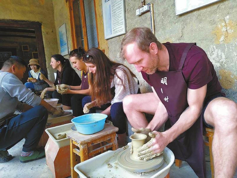 外国人在蒲江明月村体验陶艺制作。欧小红摄