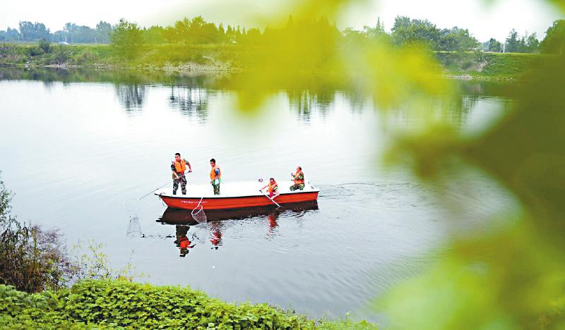 精心守护 4月9日,在成都崇州市崇平镇羊马河段,当地巡河队巡河,精心守护一泓碧水。 省生态环境厅供图