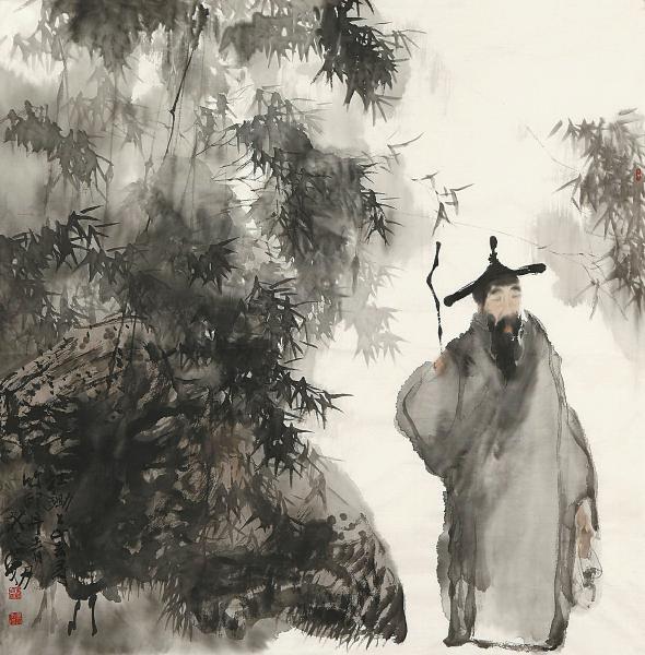 四川省诗书画院专职画家张剑,创作有大量以苏轼为主人公的作品,以此反映东坡诗意或其生平事迹、志趣品性。这件《寻竹图》便是根据苏轼对竹的喜爱绘成。苏轼曾在《于潜僧绿筠轩》一诗中写道:“可使食无肉,不可居无竹。无肉令人瘦,无竹令人俗。”这样的文字在张剑笔下得以形象化。无论苏轼还是其身边之竹,都有一种写意韵味,画面不求形似,追求的是内在精神气质的表达。这种美学特征,与苏轼本人高洁、超然的人生态度不可谓不契合。 (余如波)
