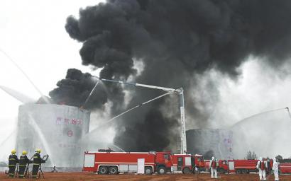 灭火排险 消防员在危化救援区灭火排险。