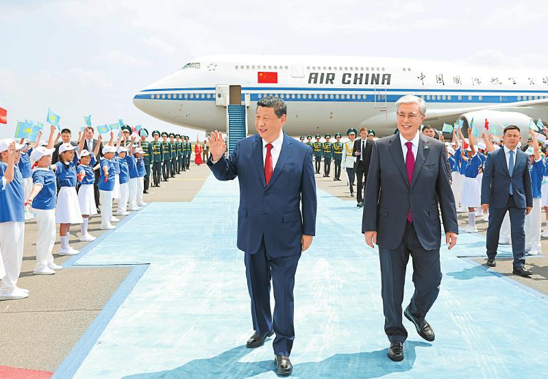 当地时间6月16日中午,国家主席习近平乘专机抵达阿斯塔纳,应哈萨克斯坦共和国总统托卡耶夫邀请,出席第二届中国-中亚峰会。这是习近平向欢迎人群挥手致意。 新华社记者 黄敬文 摄