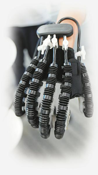 记者试戴手部康复训练机器人。四川日报全媒体记者 李强 摄