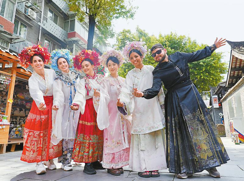 网络达人们换上中式服饰在成都宽窄巷子拍照打卡。 周宝 摄(C视觉)