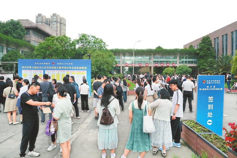 参加四川省第七届机关公文写作技能大赛的选手们正在查看考场分布图。