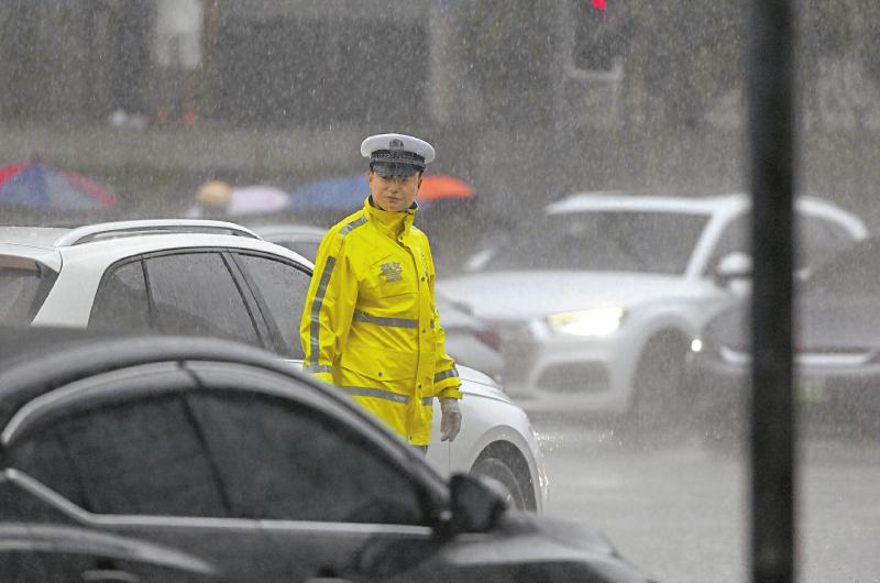 7月3日17时许,交警在成都市青羊区新华大道江汉路口疏导交通。 四川日报全媒体记者 喻茂 摄