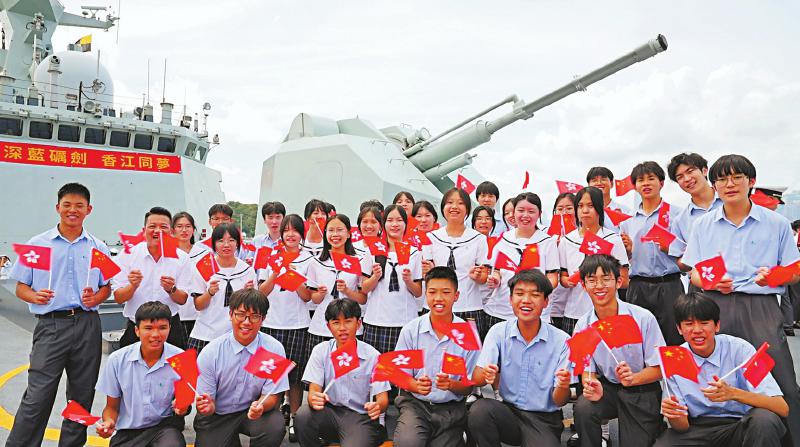 7月3日,中国海军山东舰航母编队抵达香港。这是香港中学生登上海军运城舰参观、留影。 新华社发(段振军 摄)