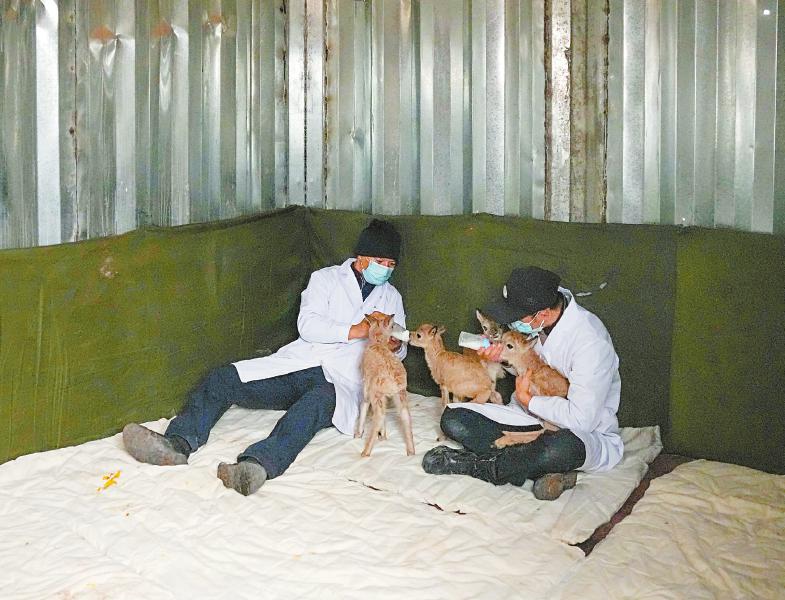 巡山队员在可可西里卓乃湖保护站给救助的小藏羚羊喂奶(7月2日摄)。