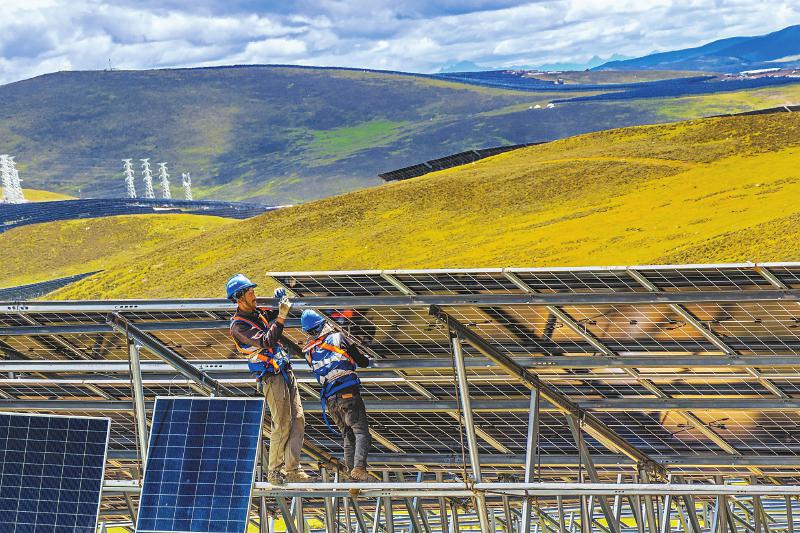 甘孜州理塘县首个百万千瓦级可再生能源项目——索绒光伏发电项目建设正稳步推进。该电站作为雅砻江流域水风光一体化基地的重大标志性项目,是四川省“十四五”可再生能源发展规划重点项目。图为9月2日,施工人员正在进行光伏发电组件、面板等设施安装作业。 林漫 摄(C视觉)