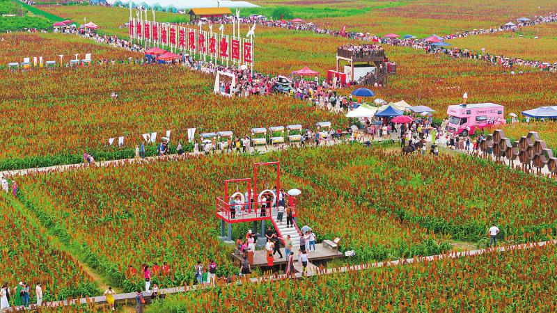 德阳绵竹市什地镇自去年打造“春赏油菜、秋赏高粱”特色景观以来,已吸引游客超30万人次,带动当地餐饮、零售、住宿等综合收入突破500万元,形成“种高粱—赏高粱—品高粱酒、吃农家宴”的产业链。图为9月7日,什地镇2025年高粱丰收节期间,什地镇五方村数百亩红高粱吸引游客前来打卡。 张波 摄(C视觉)