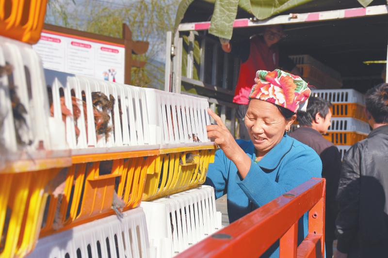 在普格县五道箐镇沙合莫村,龙马潭区购买了5000羽鸡苗免费发放给当地村民。
