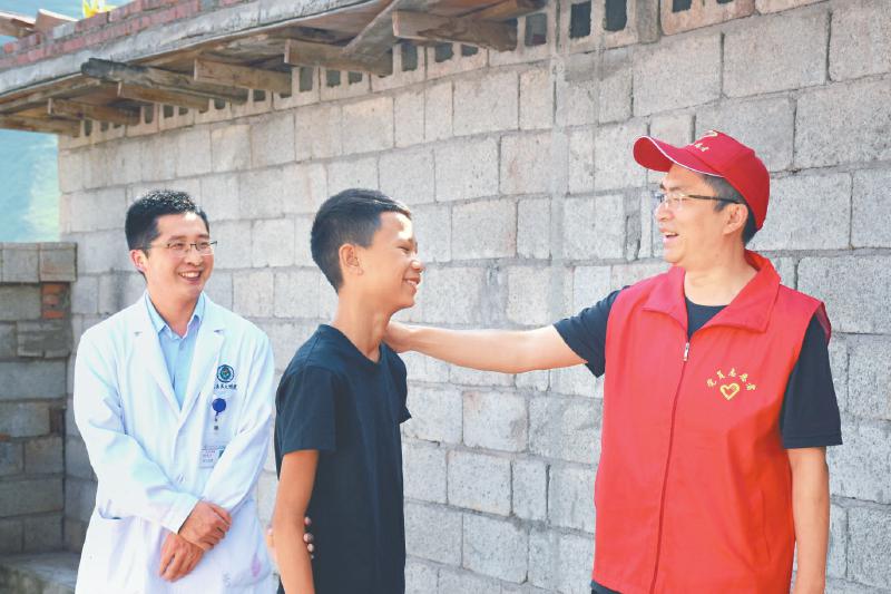 在普格县西洛镇博基村,帮扶干部陈炼(右)与援彝医疗专家邓刚(左)上门为村民阿洛成兵做康复检查。