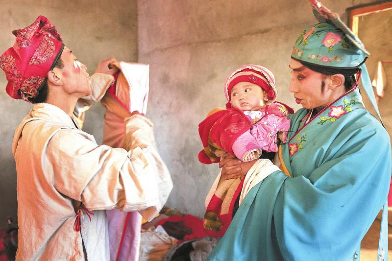 民间戏班演员给儿子唱戏,祖孙三代其乐融融(2014年3月,德阳市中江县)。 刘莉 摄