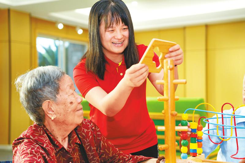 四川福彩志愿者陪同绵阳市中心社会福利院的老人一起做游戏。