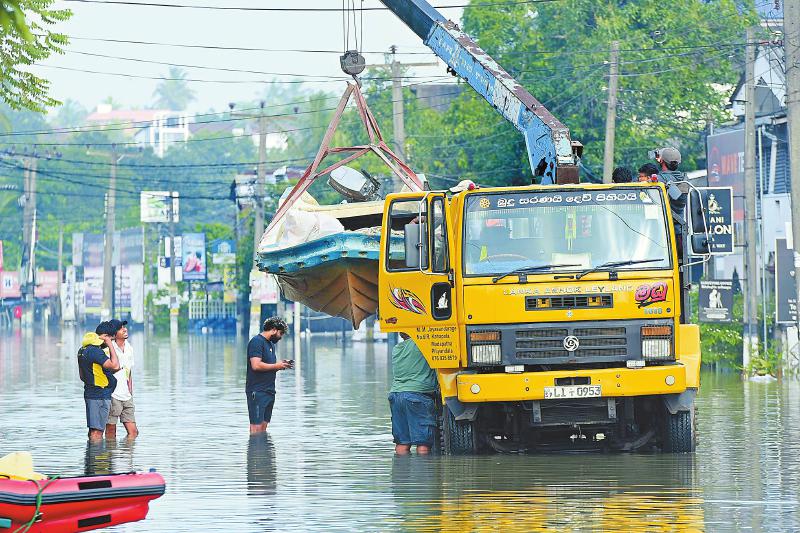 12月1日,在斯里兰卡首都科伦坡郊区,工作人员用吊车运送救援船只。 新华社发(加扬·萨米拉 摄)
