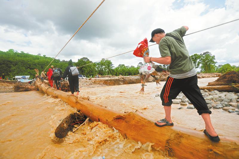 12月1日,在印度尼西亚北苏门答腊省,一名男子通过临时桥梁渡河。 新华社/美联