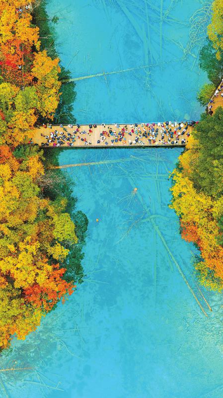 10月31日,阿坝州九寨沟景区彩林迎来最佳观赏期,众多游客在五花海赏景拍照。