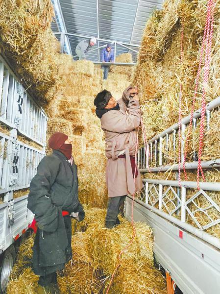尼作(前排右)帮村民卸草料。红原县委宣传部供图
