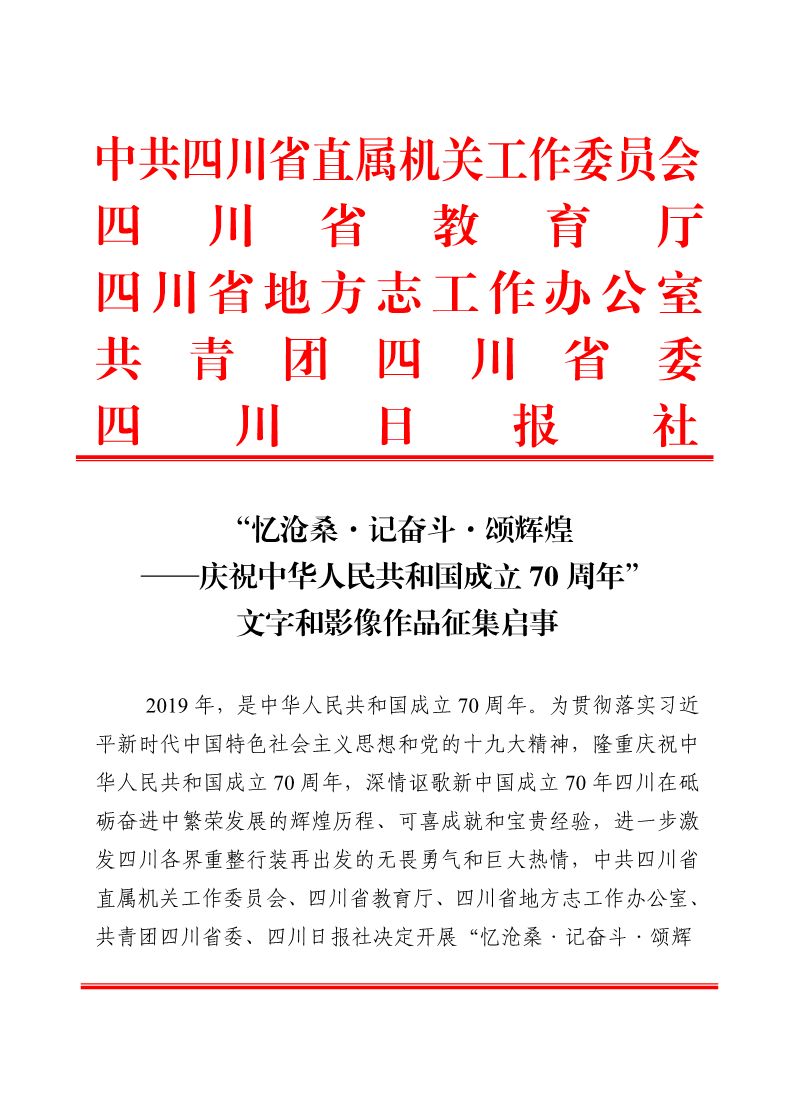 2019年,是中华人民共和国成立70周年。为贯彻落实习近平新时代中国特色社会主义思想和党的十九大精神,隆重庆祝中华人民共和国成立70周年,深情讴歌新中国成立70年四川在砥砺奋进中繁荣发展的辉煌历程、可喜成就和宝贵经验,进一步激发四川各界重整行装再出发的无畏勇气和巨大热情,中共四川省直属机关工作委员会、四川省教育厅、四川省地方志工作办公室、共青团四川省委、四川日报社决定开展“忆沧桑·记奋斗·颂辉煌——庆祝中华人民共和国成立70周年”文字和影像作品征集活动。
