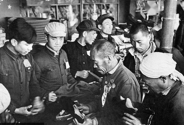 1950年,黑龙江人民扯布做鞋(图源:人民画报)