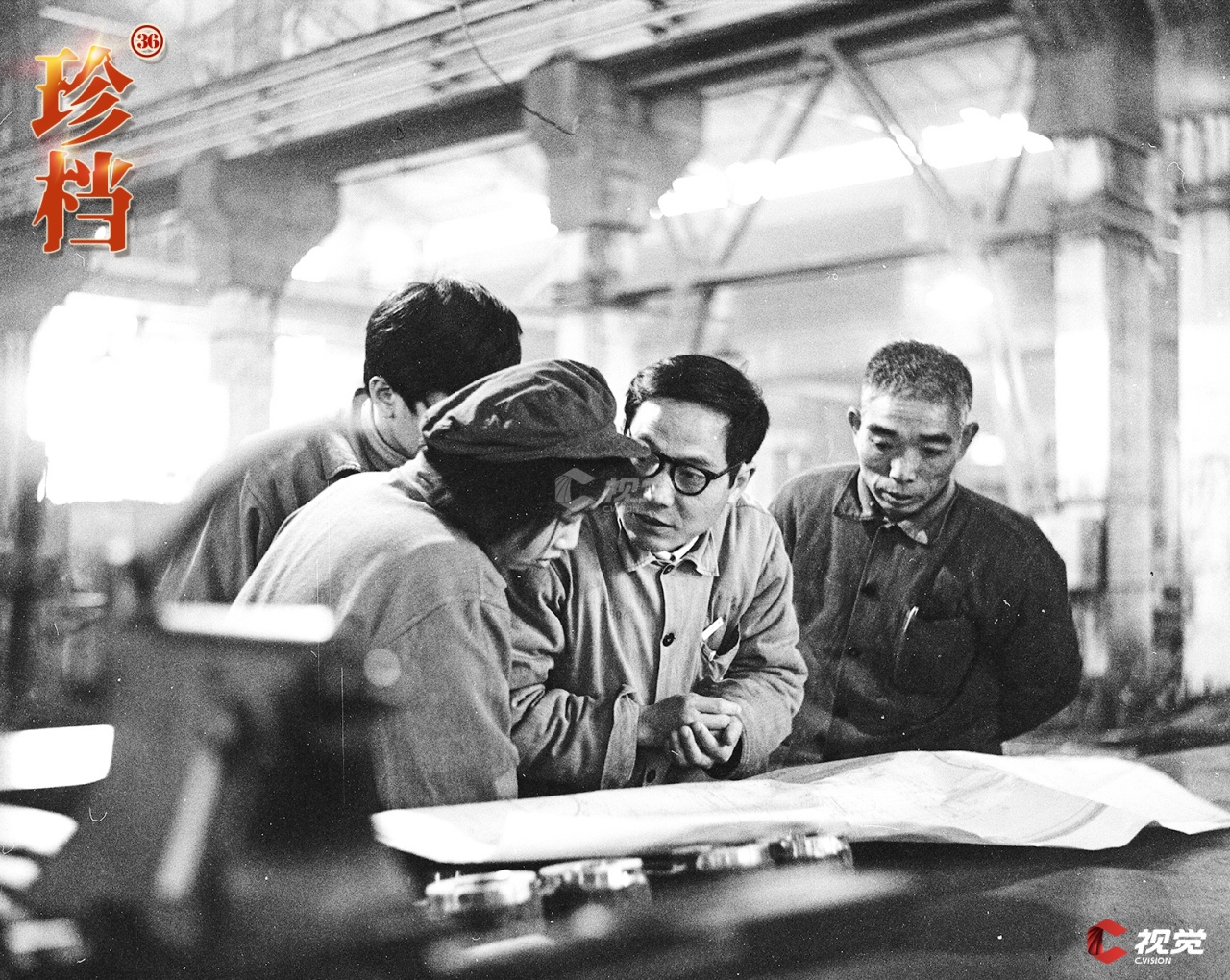 1985年,工程技术员胡生林(右二)和工人师傅们一起分析工件图纸。 吴建新