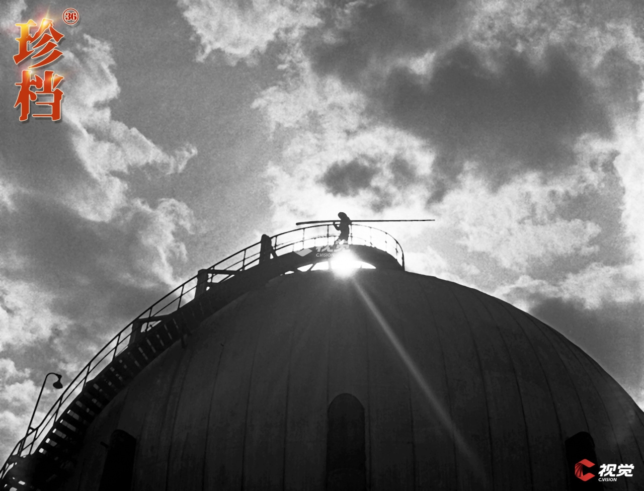 1987年,氨球施工结束。夕阳下,工人拆除最后一根架杆。 吴建新 摄