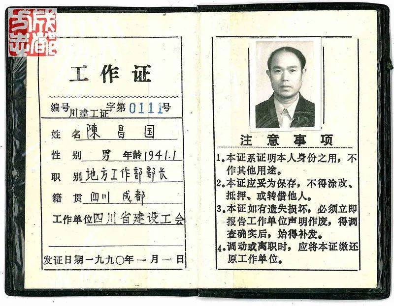 陈昌国转业到四川省建设工会任职地方工作部部长的工作证(此图由张建独家提供,未经授权不得转载)