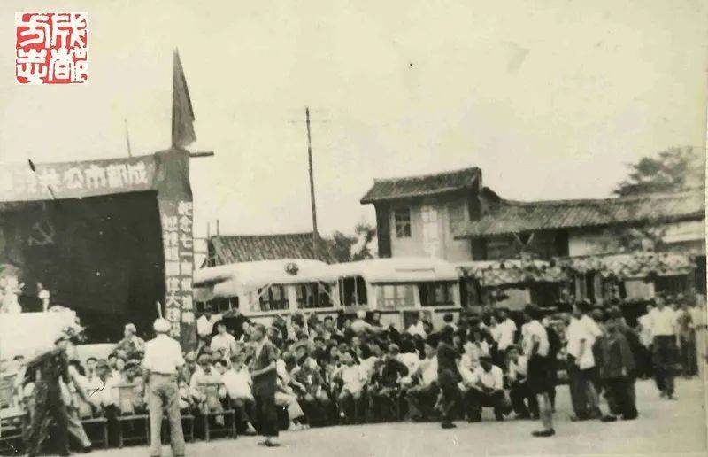 1952年7月1日上午,成都公共汽车第一线开车典礼仪式在盐市口热烈而隆重举行(此图由张建独家提供,未经授权不得转载)