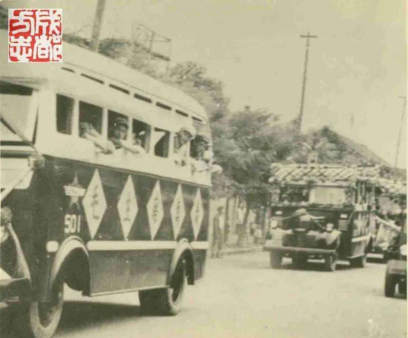1952年7月1日上午,成都同时有两个庆典仪式在举行:一是成渝铁路全线通车典礼在成都城北火车站隆重举行;二是成都公共汽车第一线开车典礼在盐市口举行,仪式热烈而隆重。