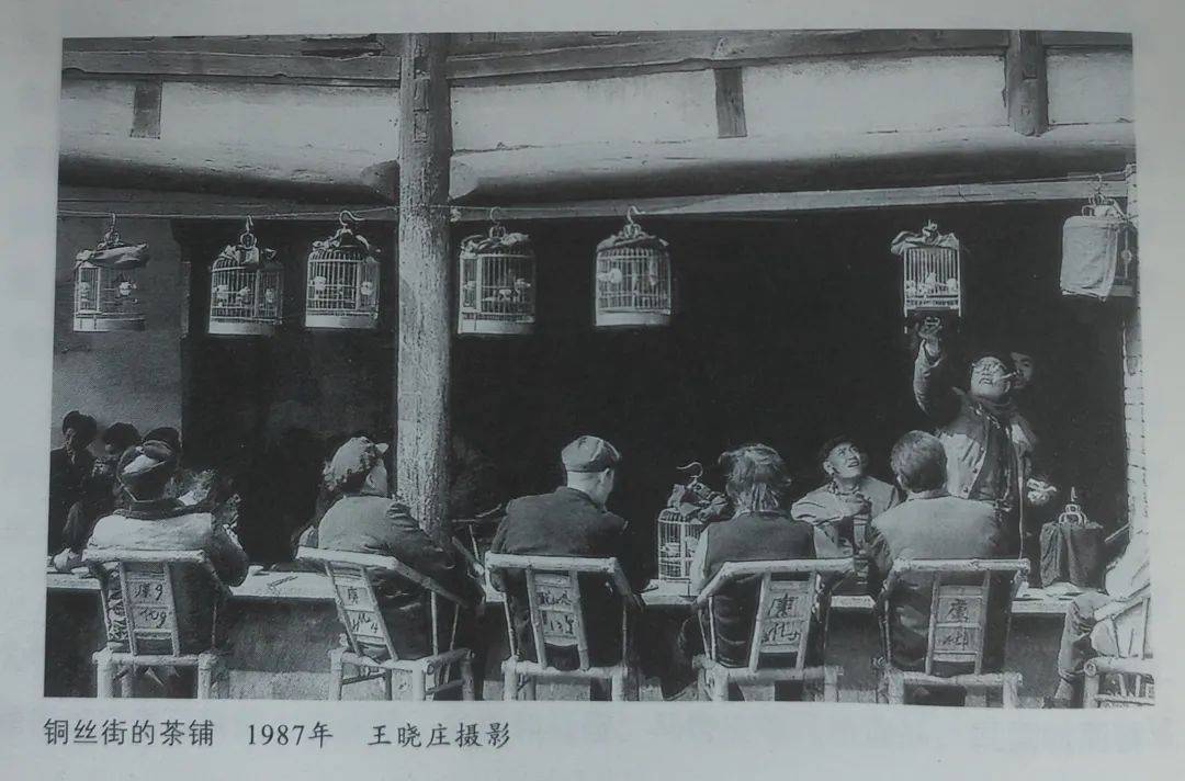 有一张拍摄于1987年的照片“铜丝街的茶铺”(王晓庄摄),一排竹椅上坐满了人,头顶上挂着一排鸟笼,大概这个时期,此茶铺又成了喂鸟人的聚集地。他们在这里喝茶赏鸟,交流心得,其乐融融,又是一道风景。