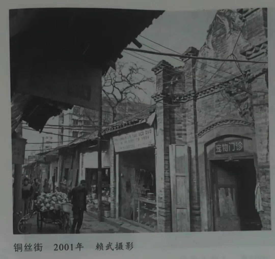 20世纪60年代,我们看到的铜丝街已经尽是些非常陈旧的公馆院落了,院墙和门楼都斑驳不堪,整条街没有街沿,最后要到玉泉街的那一段,有几家铺板房,然后是一家茶馆,才有很窄的街沿。到八十年代中期,连接玉泉街的那个口子,本来就很狭窄,还立着一根水泥电杆。有一次,一辆伏尔加小轿车从铜丝街拐进玉泉街,费了很大的劲儿,引来不少人围观。