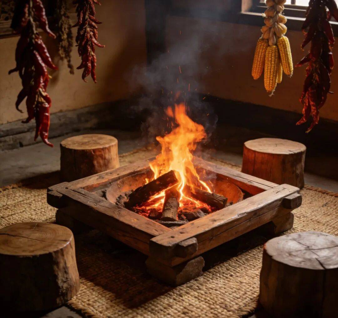 火笼是川北农村较为普遍的建筑设施。说它是建筑设施,是因为它的确是建筑的一部分,不可搬动且与房屋长久相伴,是居家取暖的必备,也是整个冬季最受宠的设施之一。修建火笼,是在地面挖一个长、宽各五十到八十公分,深三四十公分的坑,四面用石板镶边而成。其大小一般由家里人口多少决定——人口多的家庭火笼会大一点,方便家人围坐烤火。火笼大都建在堂屋的一侧,接近一堵墙但并不挨着墙。