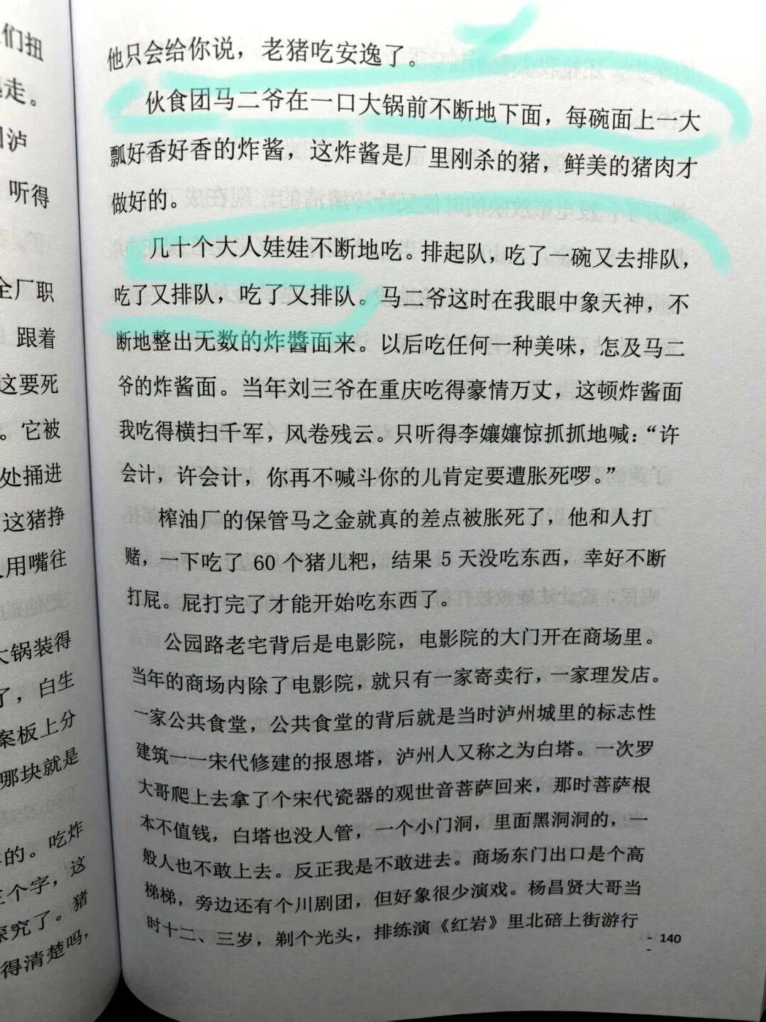 “伙食团马二爷在一口大锅前不断地下面,每碗面上一大瓢好香好香的炸酱……几十个大人娃娃不断地吃。排起队,吃了一碗又去排队,吃了又排队。”