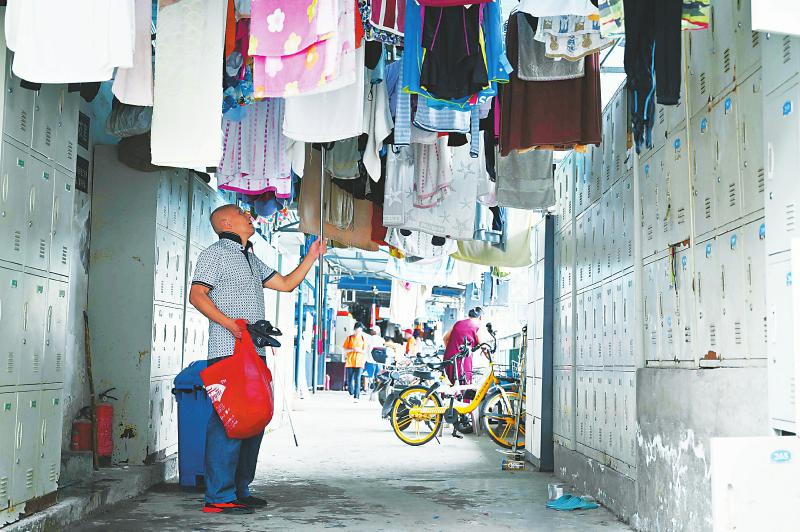 5月28日,游泳场内的存物柜上方挂满了长期游泳人的浴巾和游泳衣物,这里就是游泳人之家。