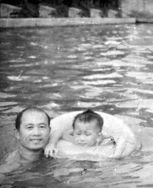 1987年夏天,陈忠厚带一岁多的儿子在兴奥游泳池游泳。 (陈忠厚供图)