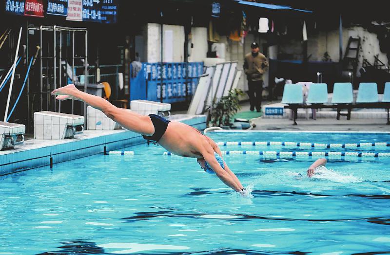 2020年12月15日,69岁的冬泳爱好者贺大爷跃入泳池。