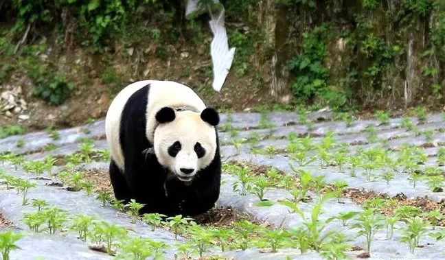 2018年5月31日,一只大熊猫来到汶川县绵虒镇金波村的田地里(图片来源:新华网)