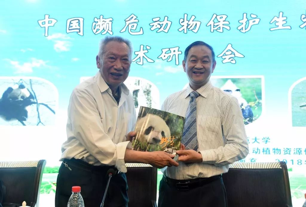 中国科学院院士、大熊猫专家魏辅文向西华师范大学教授、“熊猫教父”胡锦矗赠书(图片来源:西华师范大学网)