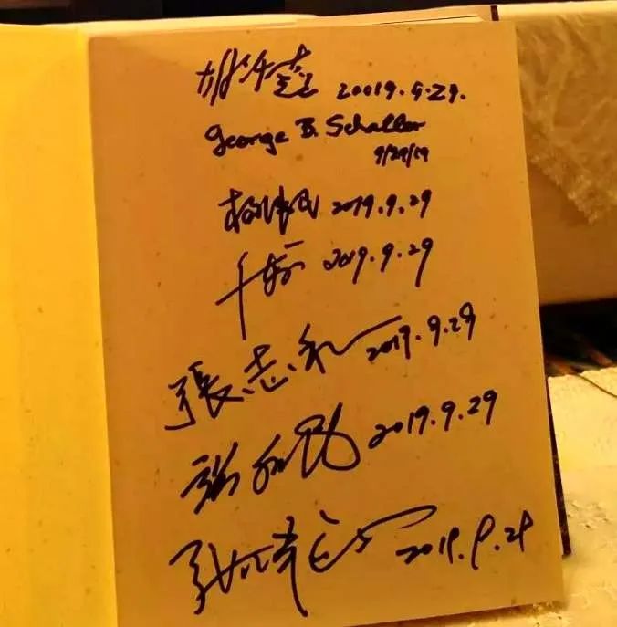 2019年9月29日,中外顶级大熊猫专家共同在《大熊猫图志》上签名。从上至下依次为:胡锦矗(西华师范大学教授,誉为“熊猫教父”“熊猫教授”),乔治·夏勒(国际野生生物保护学会顾问),杨伟民(全国政协常委、经济委员会副主任),魏辅文(中国科学院院士、研究员),张志和(成都大熊猫繁育研究基地主任、四川省大熊猫科学研究院院长),张和民(中国大熊猫保护研究中心常务副主任、教授级高级工程师),张泽钧(西华师范大学研究员)(图片来源:四川省地方志办)