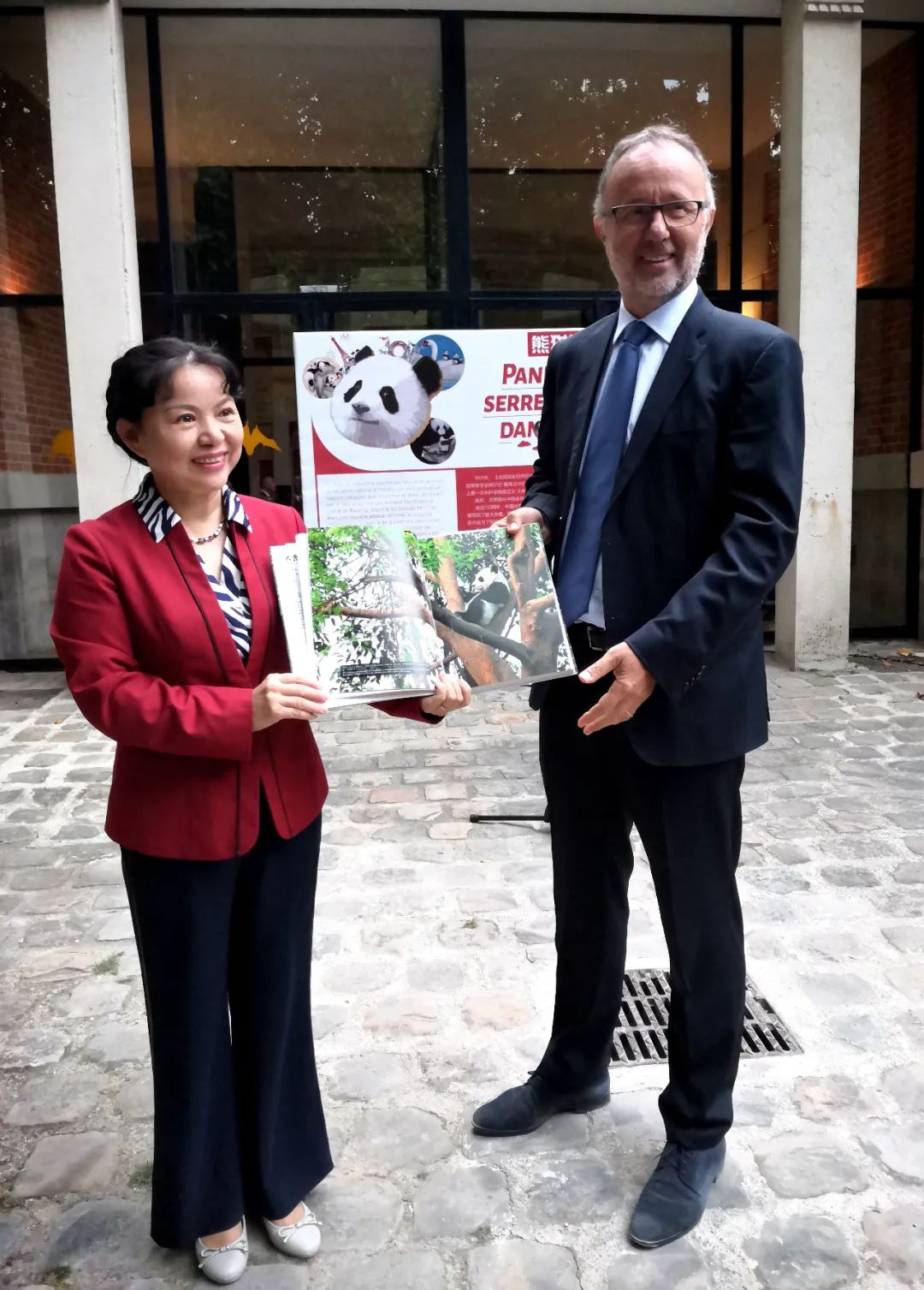 巴黎当地时间2019年9月5日,四川省林业和草原局副局长包建华(左)出席“大熊猫走向世界150周年历史文化展”,将《大熊猫图志》赠送给法国国家历史自然博物馆主席大卫·布鲁诺先生(包建华 供图)